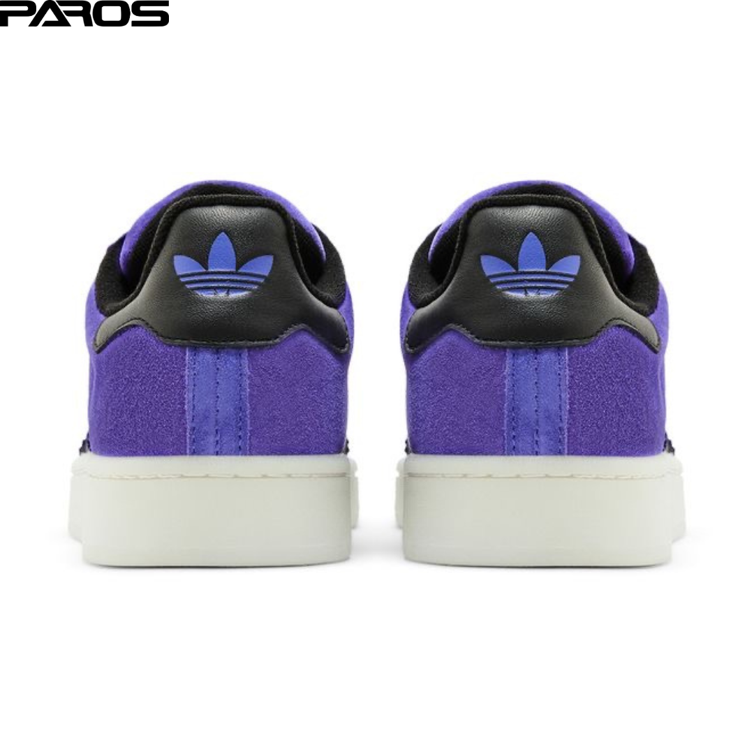 While its colorway is principally Energy Ink, the adidas Campus 00s feature a white midsole with visible stitching around the shoe. Its upper sports a leather finish in a purple hue. The Energy Ink tone also appears on the eyestay overlays with punched eyelets, wide black laces, and a padded tongue. The tongue logo is a black rubber patch with purple accents and an embossed Trefoil. The signature three stripes in core black and rugged outlines adorn the quarter panels. The lateral side displays the "CAMPUS" branding in zoomed-out white block lettering.
