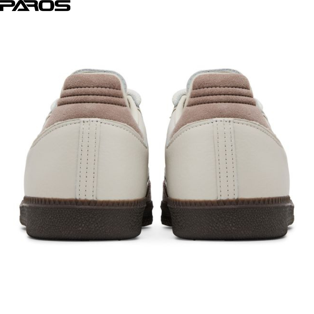 Crafted with a premium tumbled leather upper in a talc hue, the shoe features tonal suede overlays on the toe box and heel tab, adding depth and texture. The standout design element is the trio of stripes, which are executed in two layers: a 6 oz canvas underlay with raw edges, overlaid by rounded-edge leather stripes with a backside graphic print. This unique approach gives the classic design a modern twist