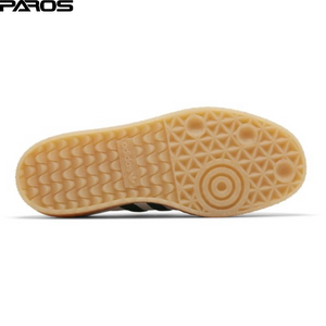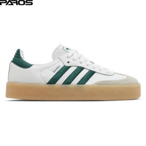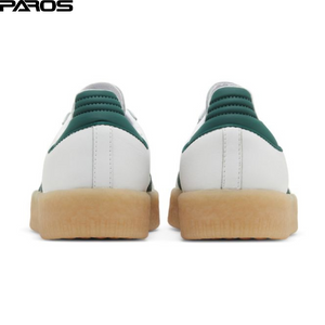 The adidas Women's Sambae 'White Green Gum' breathes new life to the sneaker icon, highlighted by exaggerated tooling and a streamlined build. Smooth white leather is utilized on the upper, fortified with a stitch-and-turn forefoot overlay in off-white suede. adidas' three-stripe branding is rendered in green embroidery, matching the leather back tab and the Trefoil tag printed on the tongue. Supporting the low-top is a platform midsole in semi-translucent gum rubber.