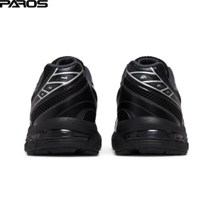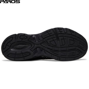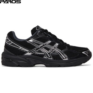 The ASICS Gel 1130 'Black Pure Silver' combines black open-cell mesh with tonal synthetic leather overlays. Metallic silver accents land on the signature tiger stripes, toe wrap and heel overlay. Grey textile lines the collar, maintaining the shoe's neutral palette. Lightweight cushioning arrives via a solid black EVA midsole with a shock-absorbing Gel insert in the heel.