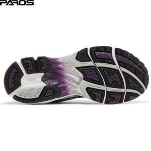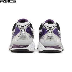 The ASICS Women's Gel Kayano 14 'Silver Grape' combines breathable white mesh with synthetic leather overlays in metallic silver. Arcing black lines form the signature tiger stripes, while a curved heel overlay is rendered in a metallic violet hue. Lightweight cushioning comes courtesy of a two-tone foam midsole with purple-tinged Gel inserts in the forefoot and heel.
