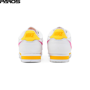 The Nike Cortez Leather sneaker is a fashion-forward interpretation of the iconic track shoe first introduced in 1972. Revealed in April 2019, this 'Spring Pack - Fuchsia' women's edition enlivens the premium white upper with neon Swooshes and a Laser Orange heel badge. Serrated eyestays, traditional lacing and a T-toe echo the original tooling. A bright stripe updates the signature foam sole.