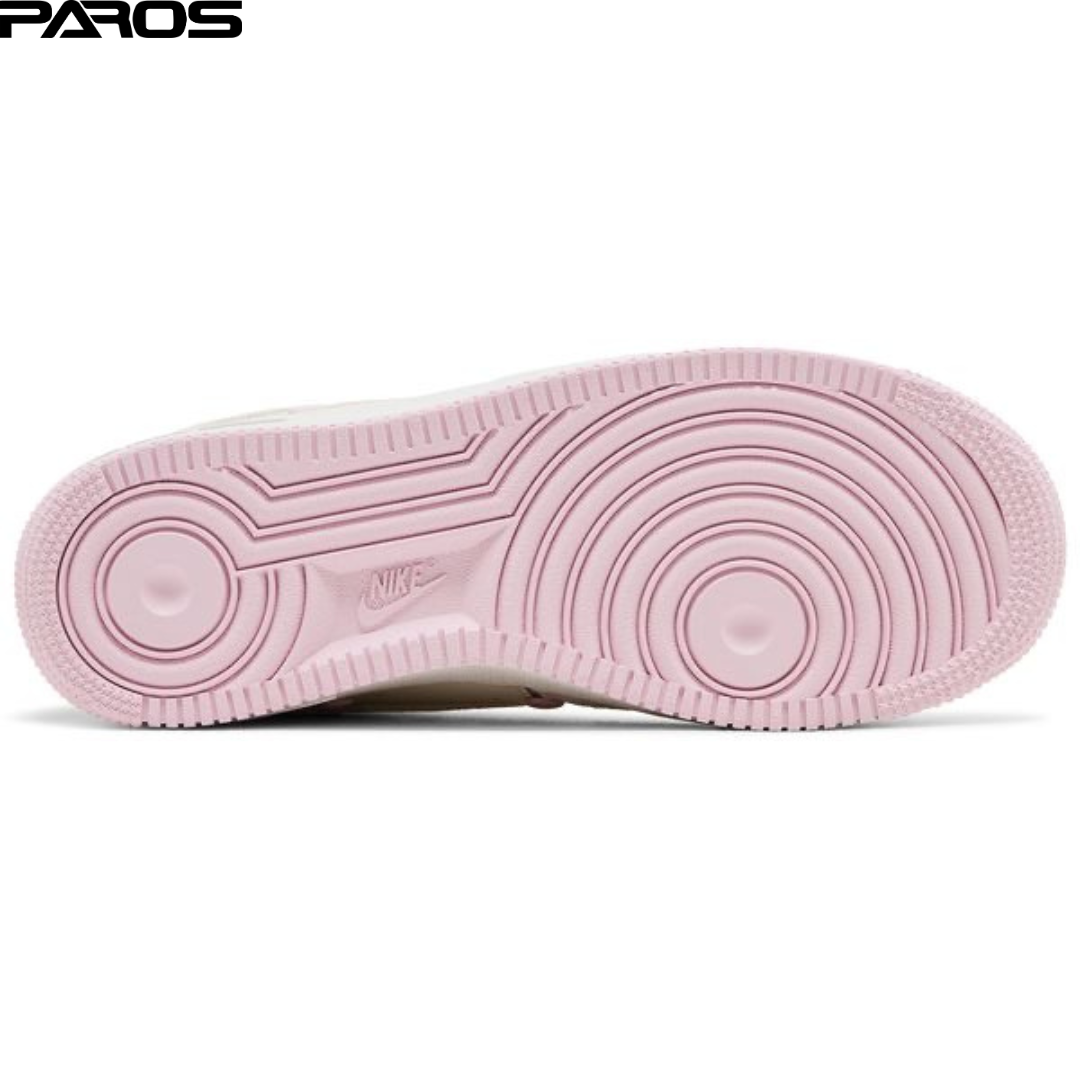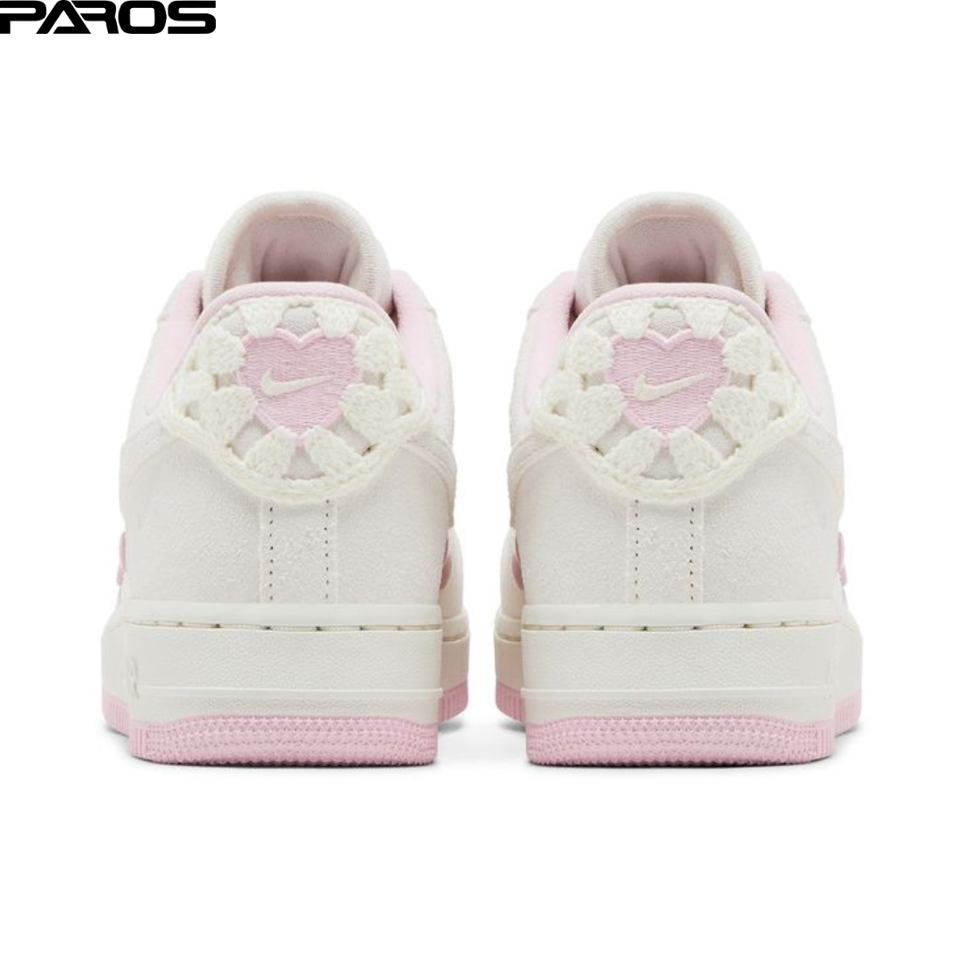 The Nike Women's Air Force 1 Low 'Valentine's Day 2025' employs a Sail-colored leather upper with tonal suede overlays at the forefoot and heel. A quartet of molded pink hearts adorn the quarter panel, while the back tab features crocheted detailing around a pink heart marked with an embroidered mini-Swoosh. A graphic on the tongue tag and insole displays Nike branding inside a heart-shaped cherry. The sneaker rests on an off-white rubber midsole, supported underfoot by a pastel pink outsole.