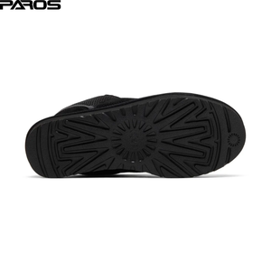 The upper of the Black (Women's) UGG Lowmel, built for comfort, is fashioned from black suede with recycled ballistic canvas mesh at the toe box and padded collar. A padded, oversized tongue and a black webbing pull tab at the heel to ease on/off are also black. Thick plaid laces made from recycled polyester fibers are meant to be worn loose and open. Tonal UGG branding is embossed on the tongue and lateral heel. The molded EVA footbed is supported under foot by a sugarcane EVA outsole with a starburst pattern for absorbing impact and providing grip.