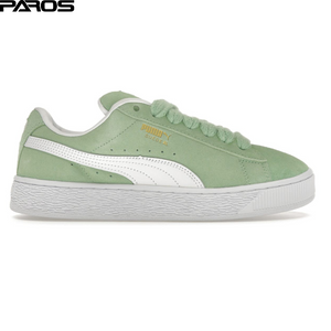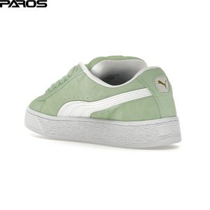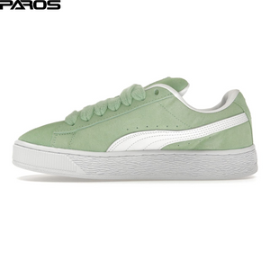 The PUMA Suede XL 'Pure Green' combines Y2K-inspired style with the classic design DNA of the iconic Suede silhouette. Extra-wide laces secure the suede upper, finished in a pastel green hue with an oversized tongue and heavily padded collar. A white leather Formstrip sweeps across the side panel, while PUMA's jumping cat logo adorns the tongue and back heel. Anchoring the sneaker is a white rubber cupsole with durable stitched sidewall construction