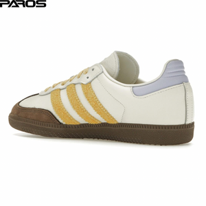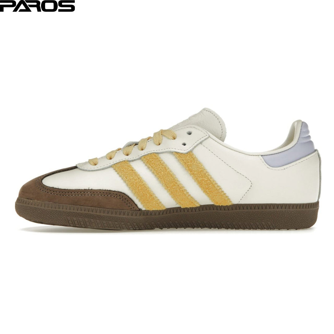 The premium leather upper of this Samba OG model is an off white color. The t-toe box with its distinctive stitching is a rich oat color that matches the rubber outsole. Three yellow, fluffy stripes with crisscross edging flank both sides of the shoe. Tonal branding sits on the tongue, while a metallic gold imprinted SAMBA sits next to the stripes. The heel tab is a violet tone without any branding. Matching yellow laces complete this lively colorway.