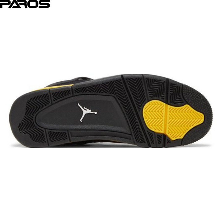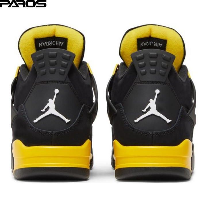 The 2023 edition of the Air Jordan 4 Retro ‘Thunder’ brings back the coveted colorway originally released in 2006 (and previously reissued in 2012). The upper is draped in smooth black nubuck, contrasted by hits of yellow on the molded eyelets, quarter panel, and lower tongue, with the latter two components covered in black netting. Jumpman branding appears on the Flight tongue tag and molded heel tab. Lightweight cushioning comes courtesy of a yellow polyurethane midsole, enhanced with an exposed Air-sole unit in the heel.