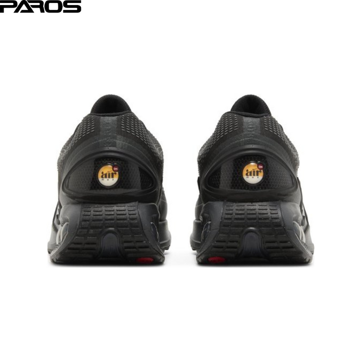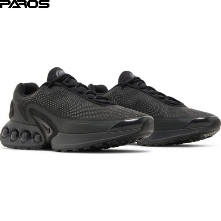 The Nike Air Max Dn 'Black Dark Grey' features an allover haptic print that adds texture to the breathable black mesh upper, marked with a retro-inspired Air Max Dn emblem on the molded TPU heel counter. A prominent TPU clip bridges the decoupled injected Phylon midsole, treated to a matching black finish and fitted with a dual-chamber, four-tubed Nike Air unit in the heel. Underfoot, the rubber outsole features a waffle tread that ties back to Nike heritage.