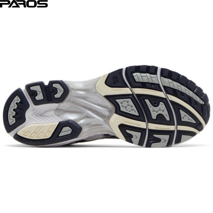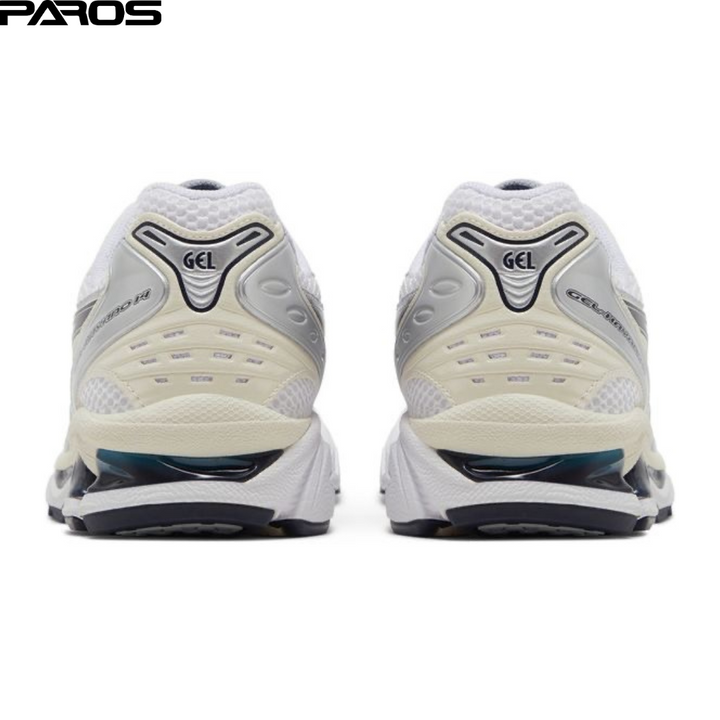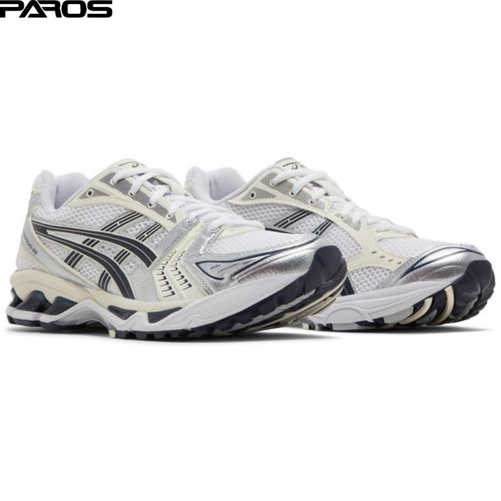 The ASICS Women's Gel Kayano 14 'White Midnight' showcases white open-cell mesh on the upper, fortified with durable synthetic leather overlays in cream and metallic silver. Heavy dark grey lines form the signature tiger stripes, while ASICS branding embellishes the tongue tag and sockliner. Visible Gel cushioning in the lightweight EVA midsole provides enhanced impact protection with every step.