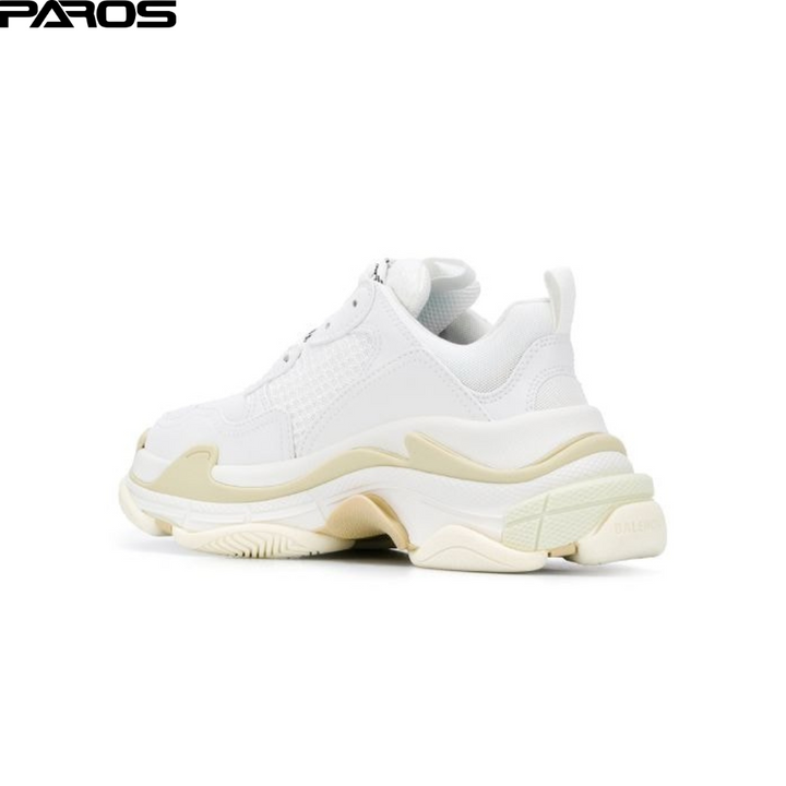 Parisian brand Balenciaga transcends fashion boundaries with the September 2017 release of the Triple S Sneaker 'White' sneaker. Sleek yet sturdy, the all-white trainer showcases contrasting Off-White detailing and Balenciaga branding for an understated look to an otherwise opulent shoe. The knit and leather upper is supported by a maximal rubber midsole underfoot, adding a touch of traditional sports shoe appeal with an unconventional, fashion-forward design.