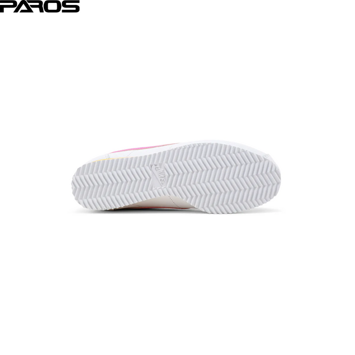 The Nike Cortez Leather sneaker is a fashion-forward interpretation of the iconic track shoe first introduced in 1972. Revealed in April 2019, this 'Spring Pack - Fuchsia' women's edition enlivens the premium white upper with neon Swooshes and a Laser Orange heel badge. Serrated eyestays, traditional lacing and a T-toe echo the original tooling. A bright stripe updates the signature foam sole.