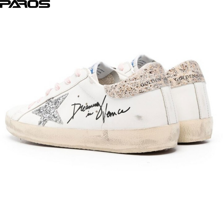 Golden Goose sneakers are renowned for their distinctive blend of luxury and vintage aesthetics. Each pair features a deliberately worn-in, distressed look that adds character and individuality. The signature star logo, often combined with unique details like glitter accents, handwritten designs, or metallic finishes, enhances their standout appeal. Designed for both style and comfort, Golden Goose sneakers are handcrafted in Italy using premium materials, making them a perfect choice for anyone seeking a chic yet effortless look with a touch of rebellion.