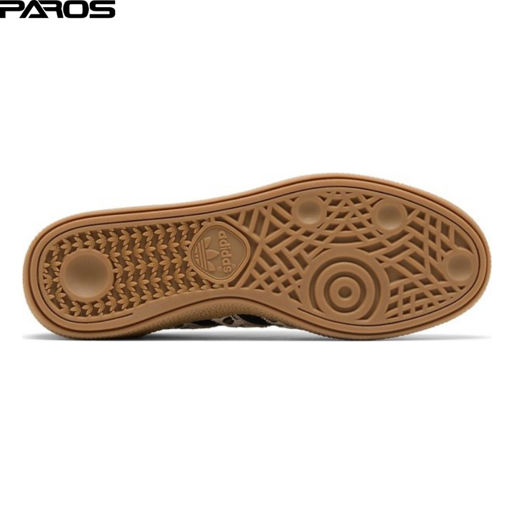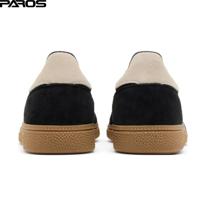 The adidas Handball Spezial originally pulled design inspiration from the handball court. The three stripes feature wonder leopard print in this iteration, and they have the jagged edges which is a staple of this silhouette. The upper is made of black suede, which gives it a premium feel and elevates the aesthetic. Notice the white SPEZIAL branding and trefoil that are imprinted alongside the top stripe on the lateral side. The back heel counter is white without branding, while the gum rubber outsole has adidas branding and perforations around the toe.