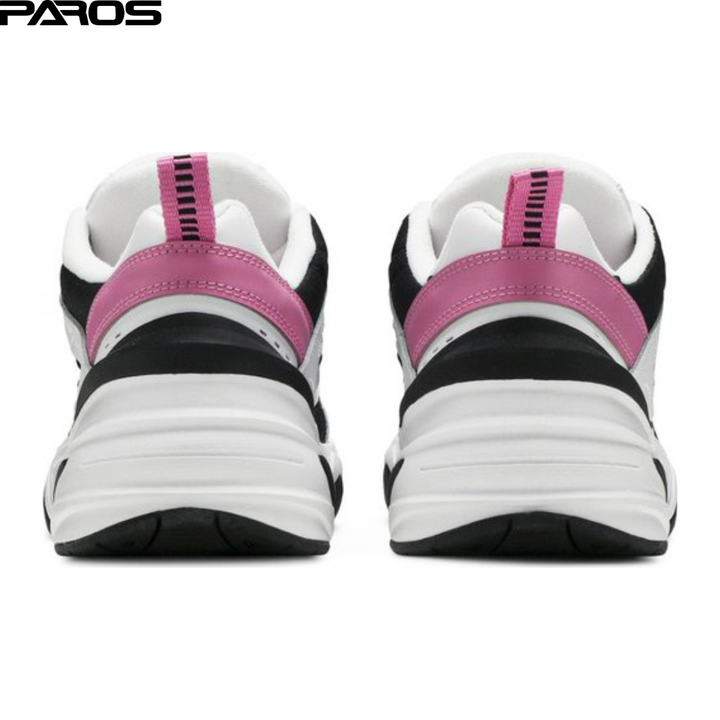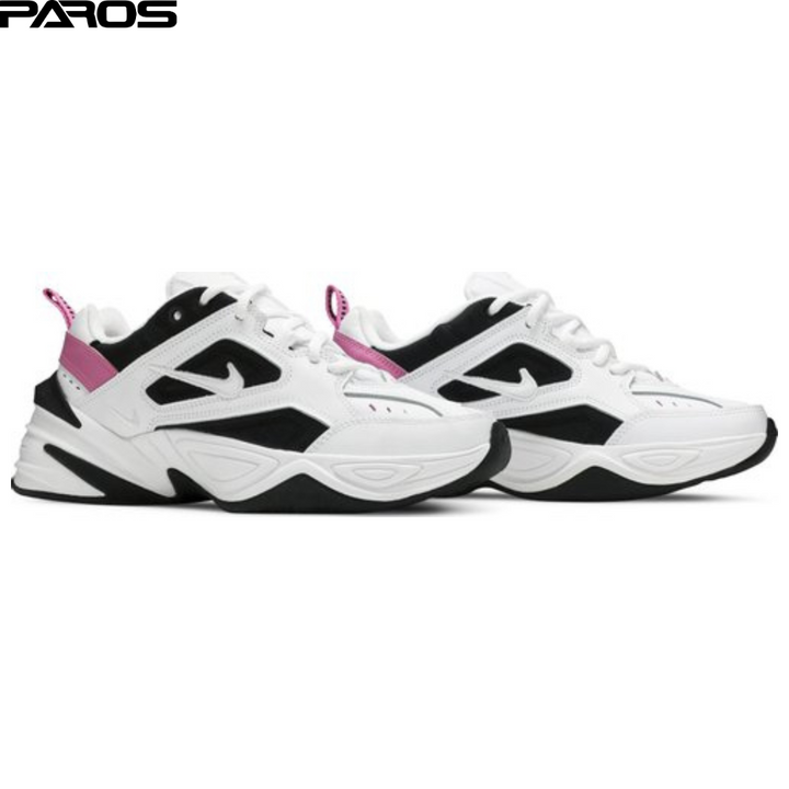 The Wmns M2K Tekno 'China Rose' takes its design cues from a classic training silhouette from 2002, the Nike Air Monarch. Along with two other versions, this black-and-white colorway with a pink heel strap was the first release after the shoe's summer introduction, hitting shelves August 15th, 2019. Like its inspiration, the mesh-lined, cushioned collar and multiple support layers combine for snug, stable ride, while updates include a TPU heel clip and beefed-up outsole tooling.