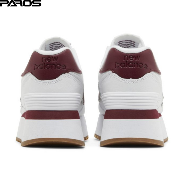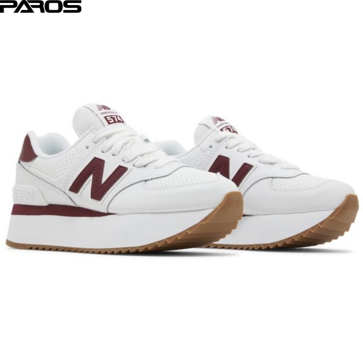 Take your sneaker game to new heights with the New Balance 574+, a bold twist on the legendary 574 silhouette. This updated version features a premium white leather upper with perforated details for breathability, accented by rich burgundy branding for a sleek, retro-inspired look.