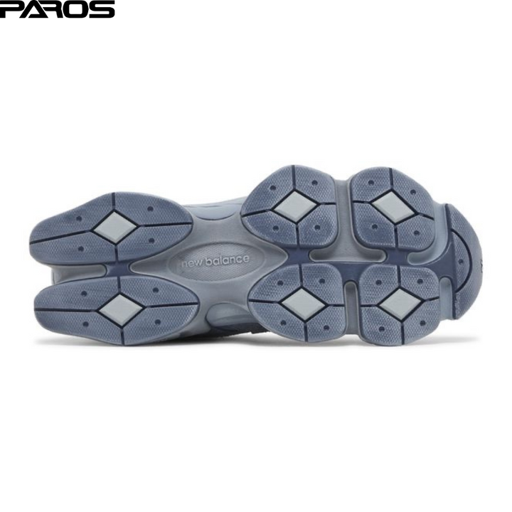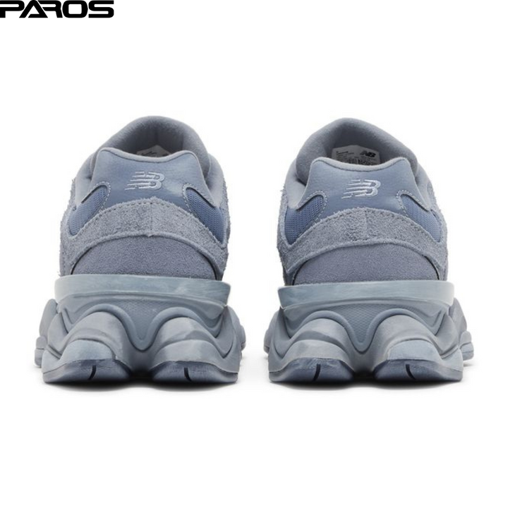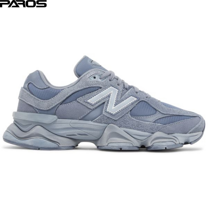 The New Balance 9060 'Arctic Grey' brings a monochrome finish in an icy grey hue to the upper, featuring a breathable mesh base with pigskin suede and synthetic leather overlays. Branding elements include a jeweled NB 9060 badge atop the tongue and an embroidered 'N' logo on the medial side. A pre-distressed finish distinguishes the dual-density ABZORB midsole, fitted with SBS heel cushioning and supported by a diamond-pattern rubber outsole.