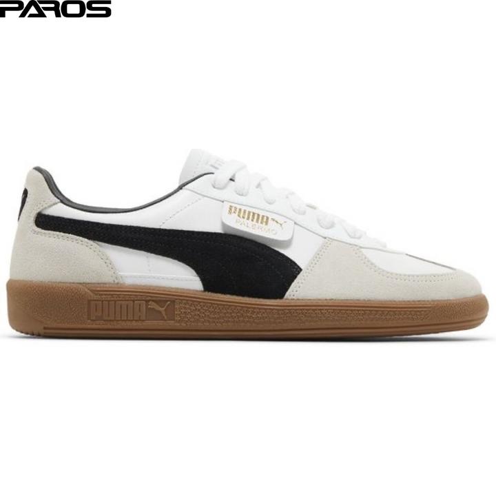 The Puma Palermo Leather ‘White Black Gum’ is a classic sneaker that combines timeless style with everyday comfort. Featuring a sleek white leather upper, it is accented by a bold black Puma Formstrip for a sharp, contrasting look. The gum rubber outsole adds a retro touch and enhances grip, making it a versatile option for casual wear. Perfect for those who appreciate understated yet iconic design, this sneaker seamlessly blends heritage and modernity.