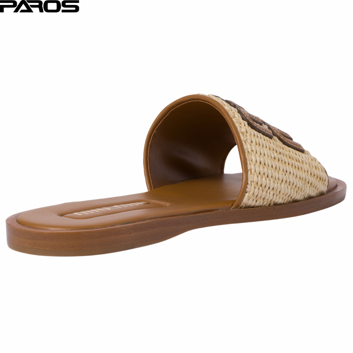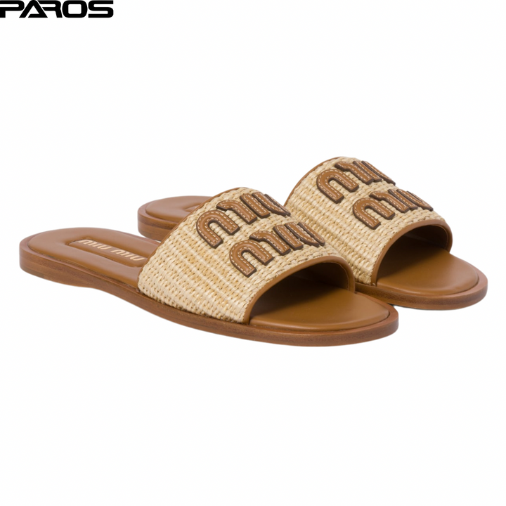 The Miu Miu Raffia-Effect Woven Fabric Slides capture effortless summer elegance with a contemporary twist. Designed with a raffia-effect woven upper, these slides offer a natural yet refined aesthetic, perfect for warm-weather styling. The slip-on silhouette ensures easy wear, while the cushioned leather insole adds comfort for all-day use. Finished with subtle Miu Miu branding, these slides are a versatile choice that pairs seamlessly with casual and vacation looks