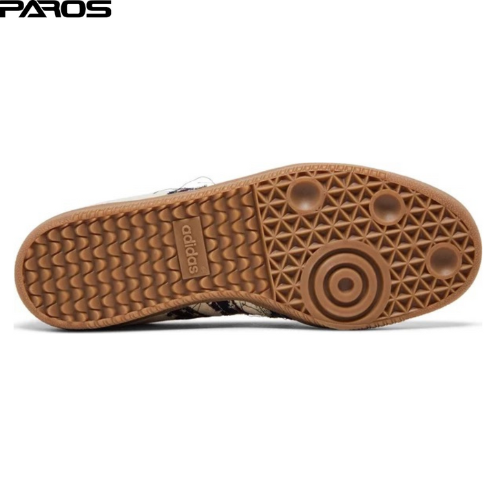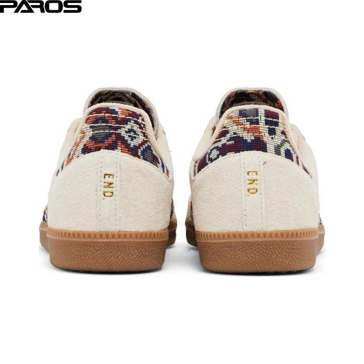 The END. x adidas Samba ‘Consortium Cup’ features a cream-hued suede upper with a tonal forefoot overlay in woven fabric. Patterned textile in a multicolor design, complete with frayed edges for a DIY-inspired look and feel, appears on the signature three-stripes and back tab. ‘Past’ is inscribed in metallic gold lettering on the lateral quarter panel — a nod to traditional weaving techniques of yesteryear — while the END. logo is stamped on the back heel. The sneaker rests on a traditional gum rubber cupsole.