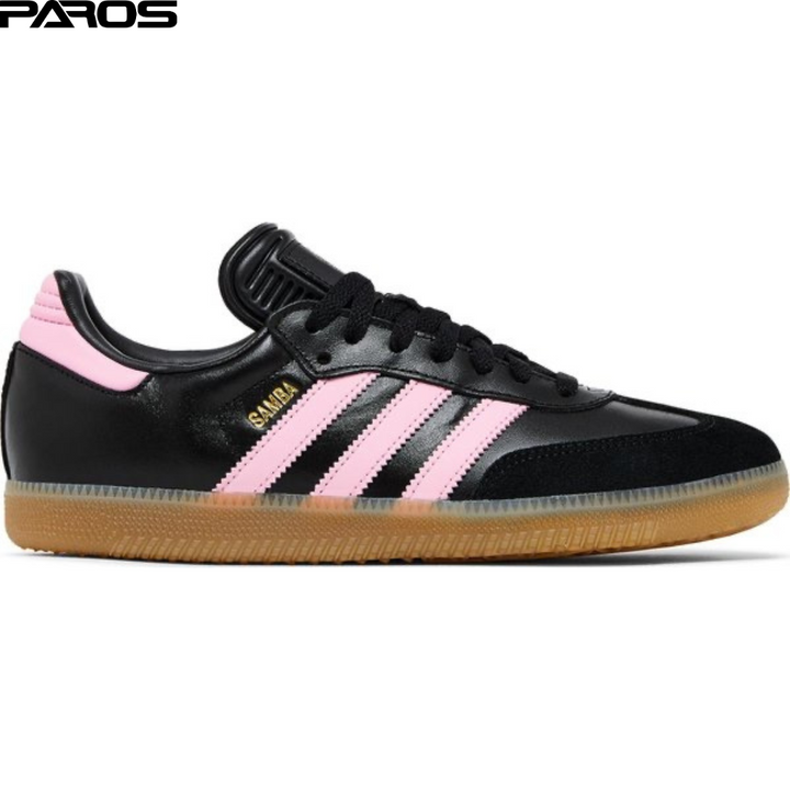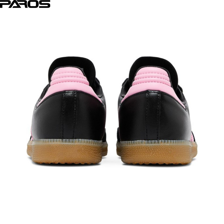 The Lionel Messi x adidas Samba 'Inter Miami CF - Away Kit' features a smooth black leather upper with the signature T-toe overlay in matching black suede. Contrasting pink leather accents settle on the back tab and serrated three-stripes. The Inter Miami CF crest adorns the tongue, while 'SAMBA' is stamped in gold foil lettering on the lateral quarter panel. Cushioning is limited to an EVA foam insole. The low-profile silhouette is completed with a semi-translucent gum rubber cupsole.