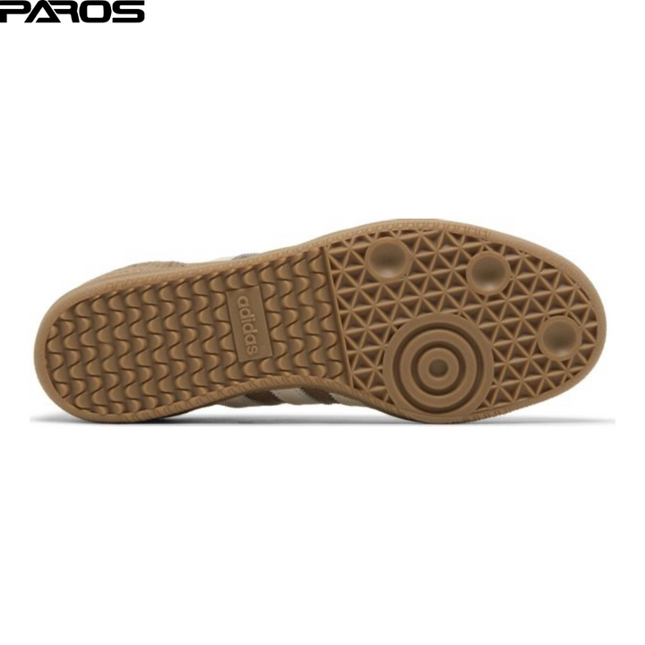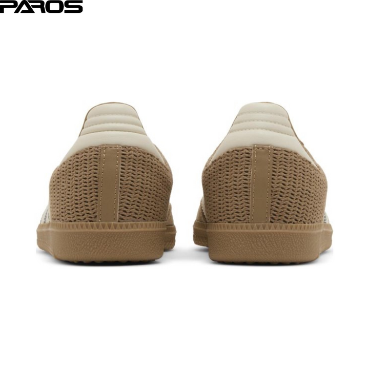 The adidas Samba OG 'Cardboard' replaces the timeless silhouette's traditional leather build with a knit textile upper in a dark tan hue. Tonal suede detailing is utilized on the eyestay and T-toe overlay. The signature three-stripes are rendered in off-white leather, matching the stitched leather back tab. Atop the tongue, a screen-printed tag displays adidas Trefoil branding. A durable gum rubber cupsole anchors the low-profile silhouette.