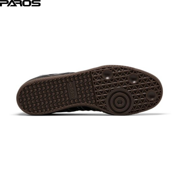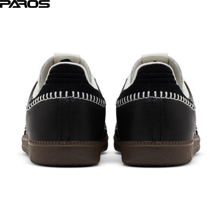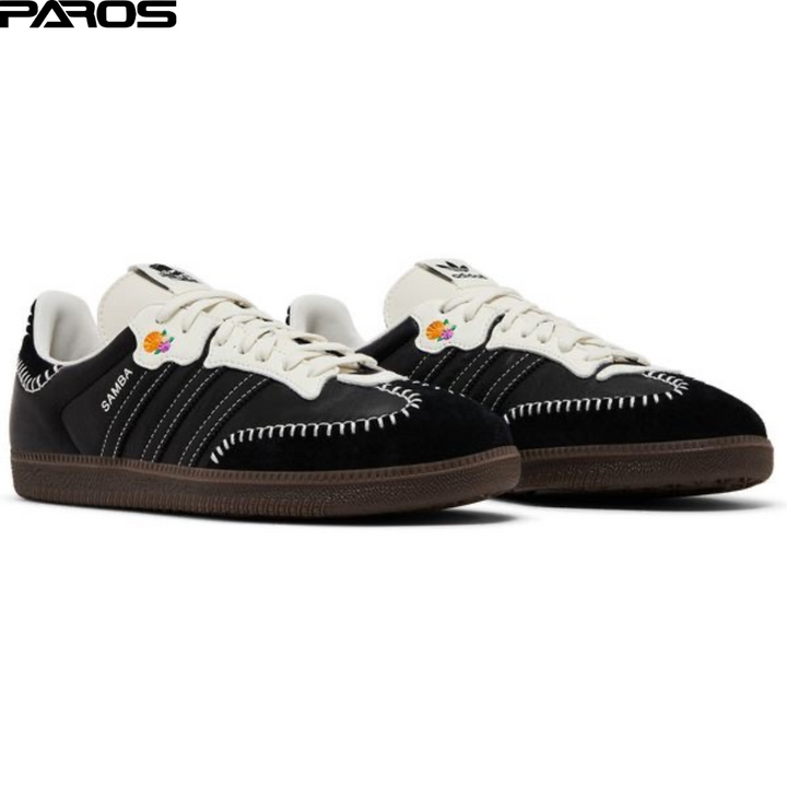 the 'Día de Muertos Pack,' the adidas Samba OG 'Black' features tonal serrated three-stripes and 'SAMBA' stamped on the lateral quarter panel. Outlined in exposed deco stitching, the back tab and forefoot overlay are rendered in black suede. The white leather eyestay is accented with embroidered florals, while the woven tongue tag displays a sugar skull graphic. The low-profile silhouette rests on a durable gum rubber sole unit.