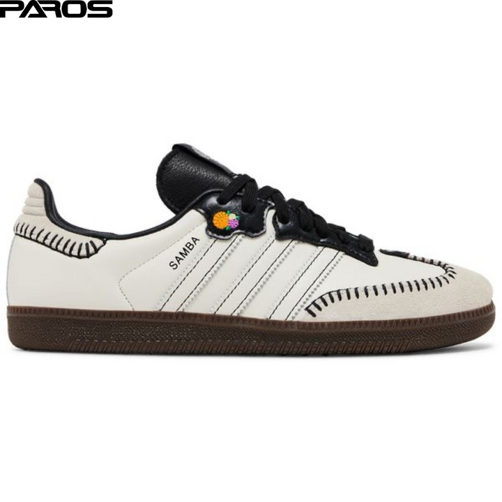 the 'Día de Muertos Pack,' the adidas Samba OG 'Off-White' delivers a festive colorway. Built with ivory-hued leather, the upper features tonal suede construction on the forefoot overlay and back tab, both of which are outlined in exposed deco stitching. Embroidered florals add a pop of color to the black leather eyestay, while a sugar skull graphic adorns the woven tongue tag. Anchoring the low-profile model is a durable gum rubber sole unit.