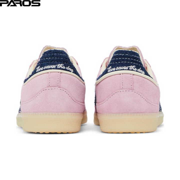 the notitle x adidas Samba OG 'Pink' is crafted from pink suede with contrasting navy suede accents. They land on the signature three-stripes, outlined in white decorative stitching, and a back tab marked with the phrase 'Love Saves the Day.' The sneaker rests on a low-profile rubber cupsole in semi-translucent gum rubber.