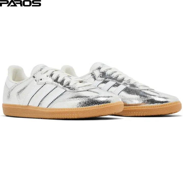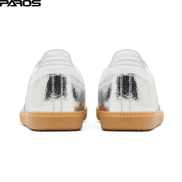 Tradition's made to be played with. These adidas shoes are fun take on our iconic Samba OG, with a silver metallic upper made of crackled leather. They're special enough for nights out but versatile enough to wear with your everyday uniform.