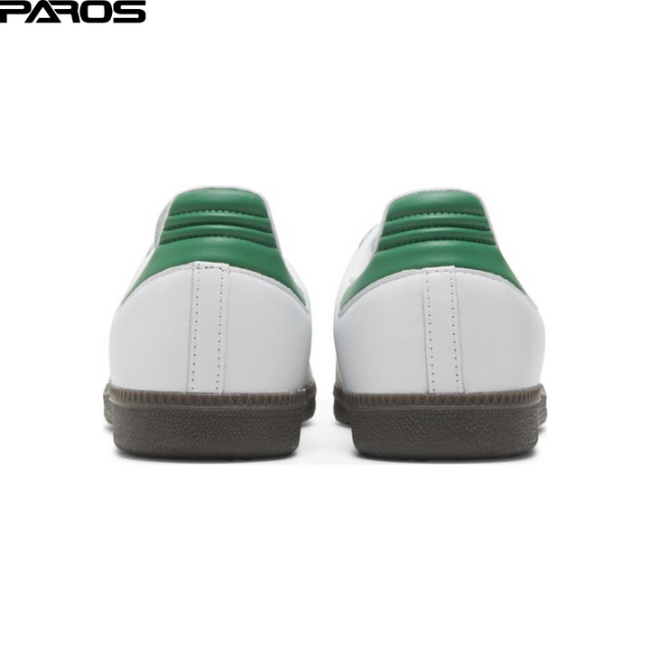 First released in 1950, adidas' Samba sneakers were designed d to provide footballers with grip and stability. This iteration is presented in white leather with green signature serrated 3-Stripes to the sides, while sat atop the traditional gum rubber outsole.