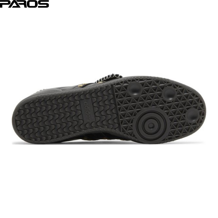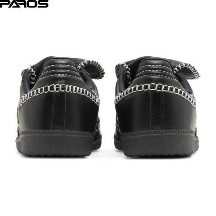 the Wales Bonner x adidas Samba 'Black' reimagines the classic model with a premium build. The sleek silhouette carries a black leather upper, lined in satin and equipped with a low-cut padded collar. Metallic studs shine on the signature three-stripes, while white deco stitching outlines the back tab and fold-over tongue, featuring a co-branded woven label. The sneaker sits atop a low-profile rubber cupsole.