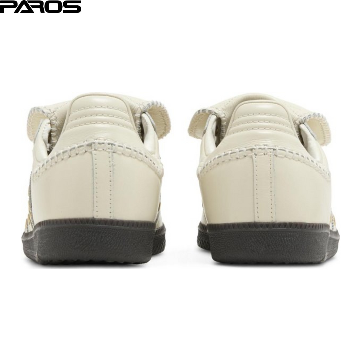 the Wales Bonner x adidas Samba 'Cream' features a full leather upper lined in satin. The shoe's iconic three-stripes are adorned with metallic studs, nodding to the signature motif of Wales Bonner's Fall/Winter 2023 apparel collection. Deco stitching surrounds the heel tab and fold-over tongue, while dual branding appears on the sockliner and woven tongue tag. Anchoring the timeless silhouette is a durable rubber cupsole.