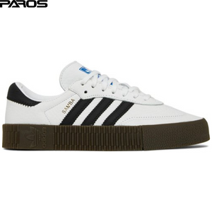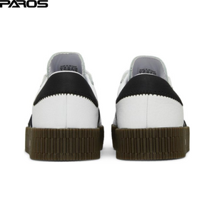 The base of the Sambarose sneaker for women in White Black Gum is a bright white color and there are black details, including the three stripes that often appear on the sides of adidas shoes. There are also black details on the heel.