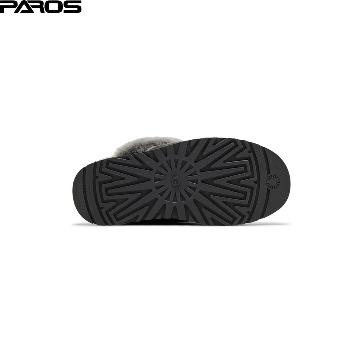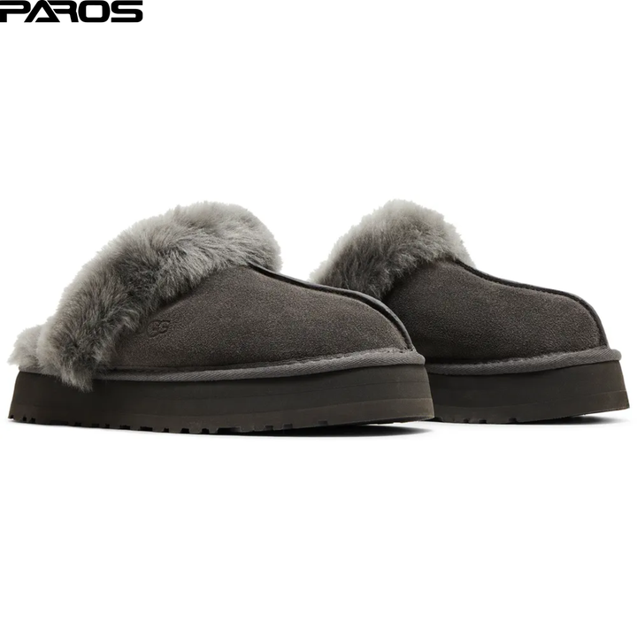 The UGG Disquette Slipper Charcoal (Women's) takes slipper style to a whole new level with its bold platform sole and rich charcoal colorway. Made from soft suede and lined with UGG's plush wool, this slipper combines fashion and comfort in one chic package. The slip-on design is easy to wear, whether you're lounging at home or heading out for a quick errand.